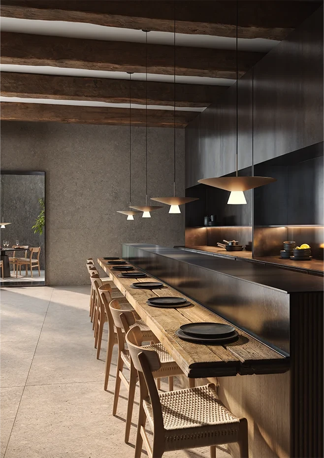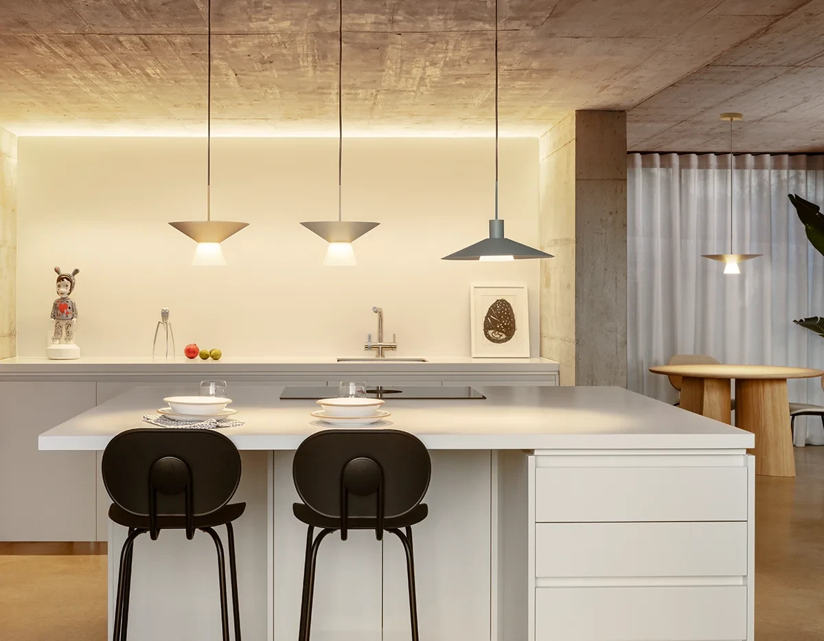 Suitable for general lighting, as well as for direct illumination above dining tables, countertops, bars, or desks. We recommend positioning the light source approximately 85 cm above the surface. For more accurate information, reffer to the photometric report.