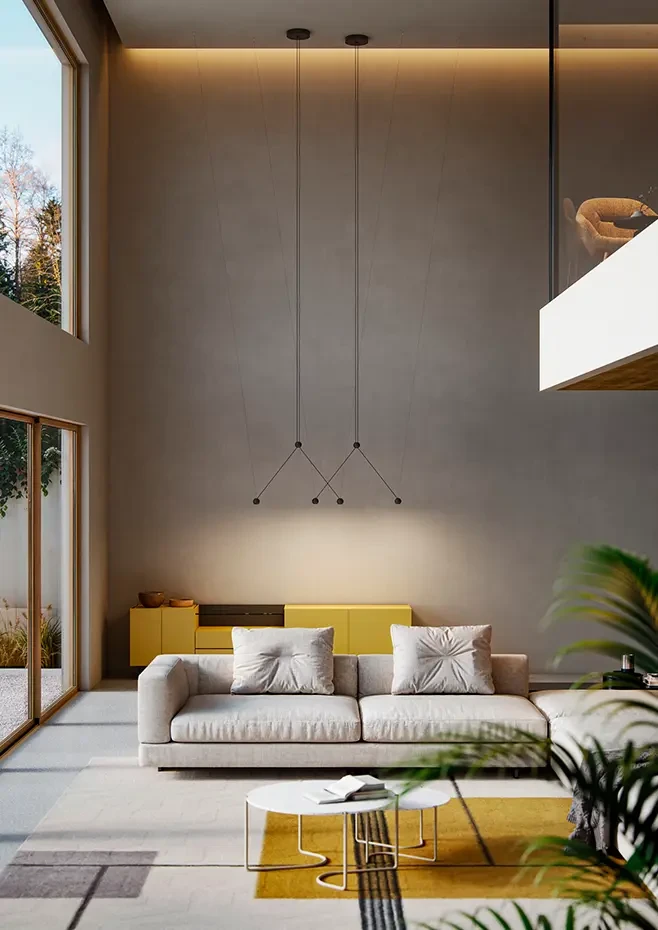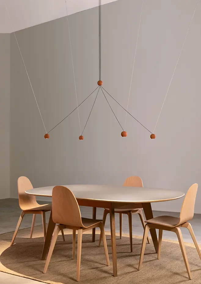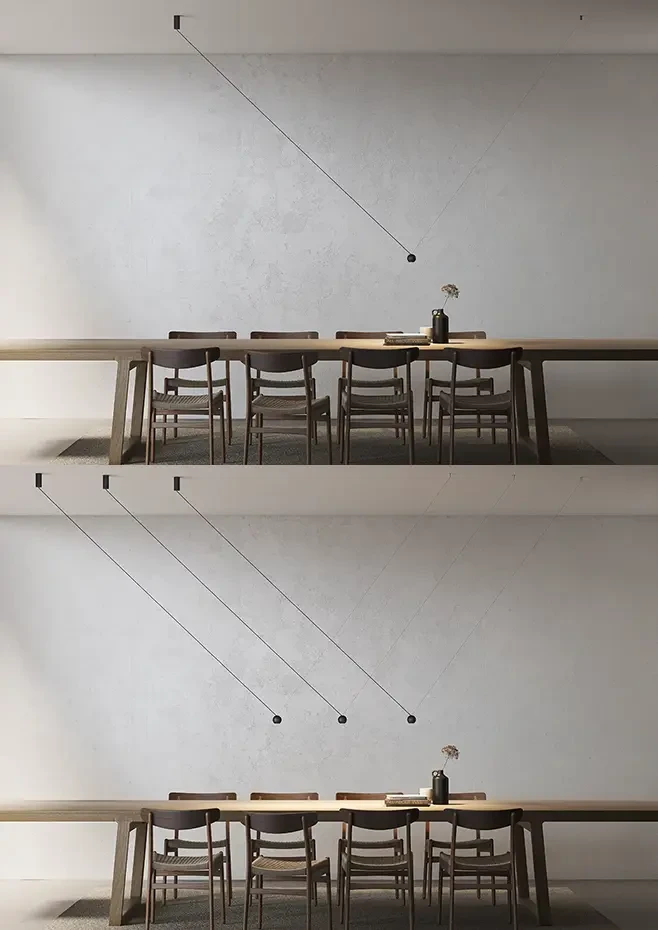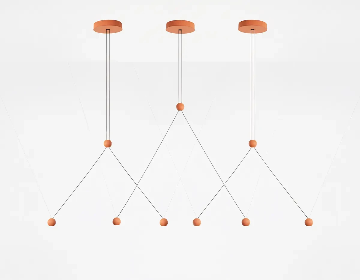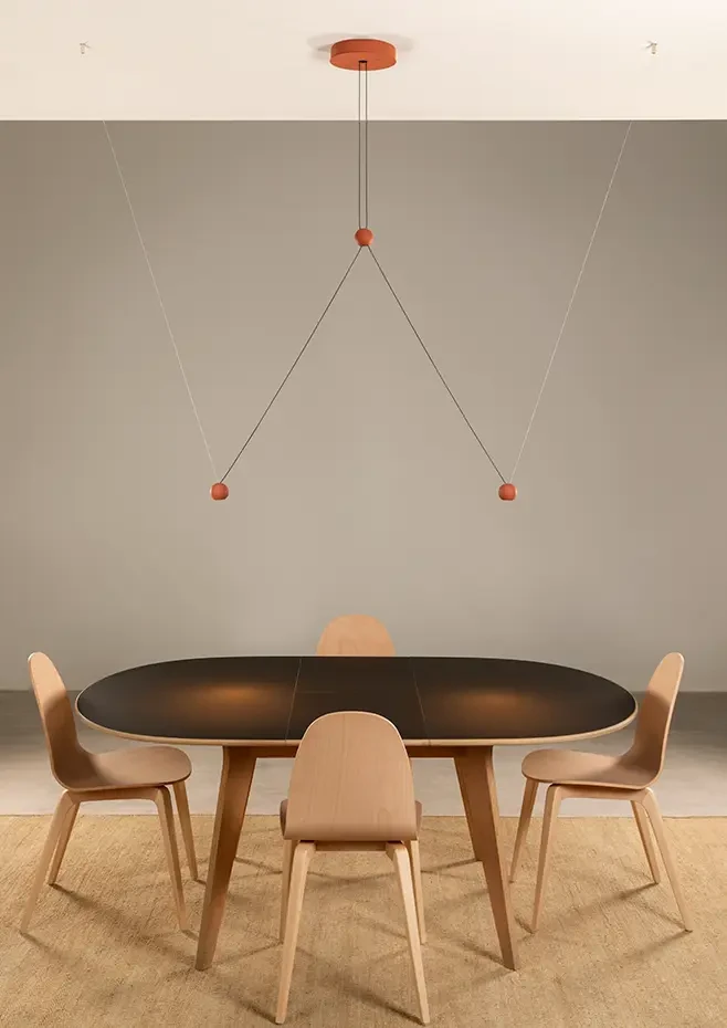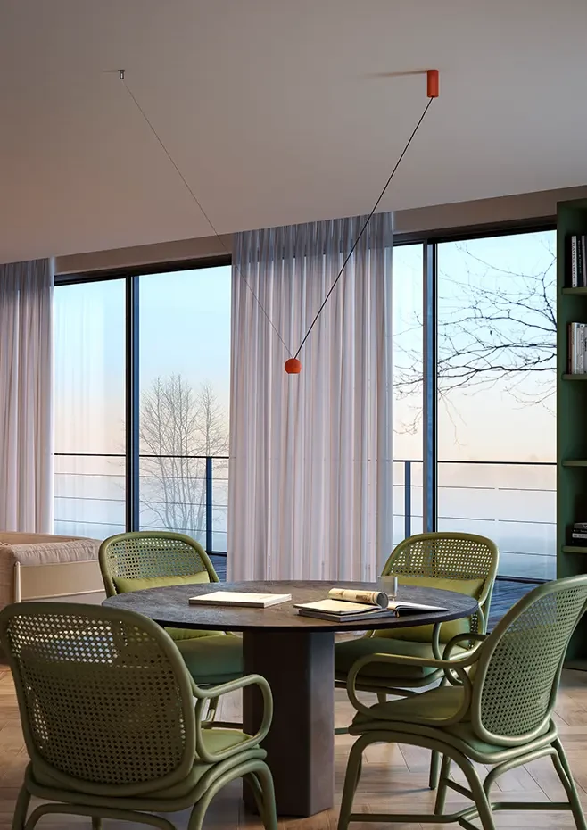 Suspension lamp designed for ambient or accent lighting, offering a direct and intense beam. A spherical diffuser hangs from a steel cable, which anchors to the ceiling, allowing precise positioning. The electrical cord runs directly to the canopy, which can be mounted either on the ceiling or on the wall — with the steel cable always fixed to the ceiling. The lamp’s height is adjustable, making it suitable as a pendant light above a table or counter, or as a ceiling or wall-mounted accent piece. Its off-center power outlet adds flexibility for creative compositions and installations.