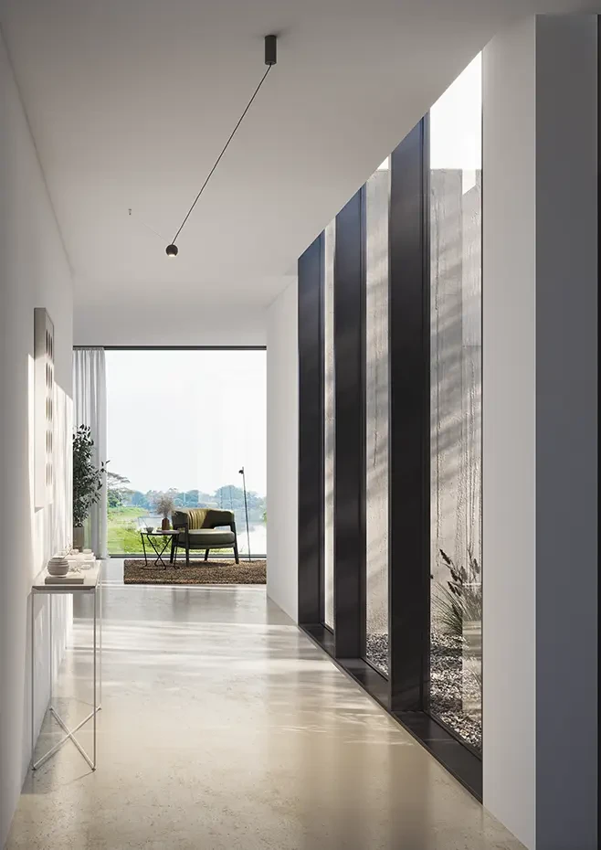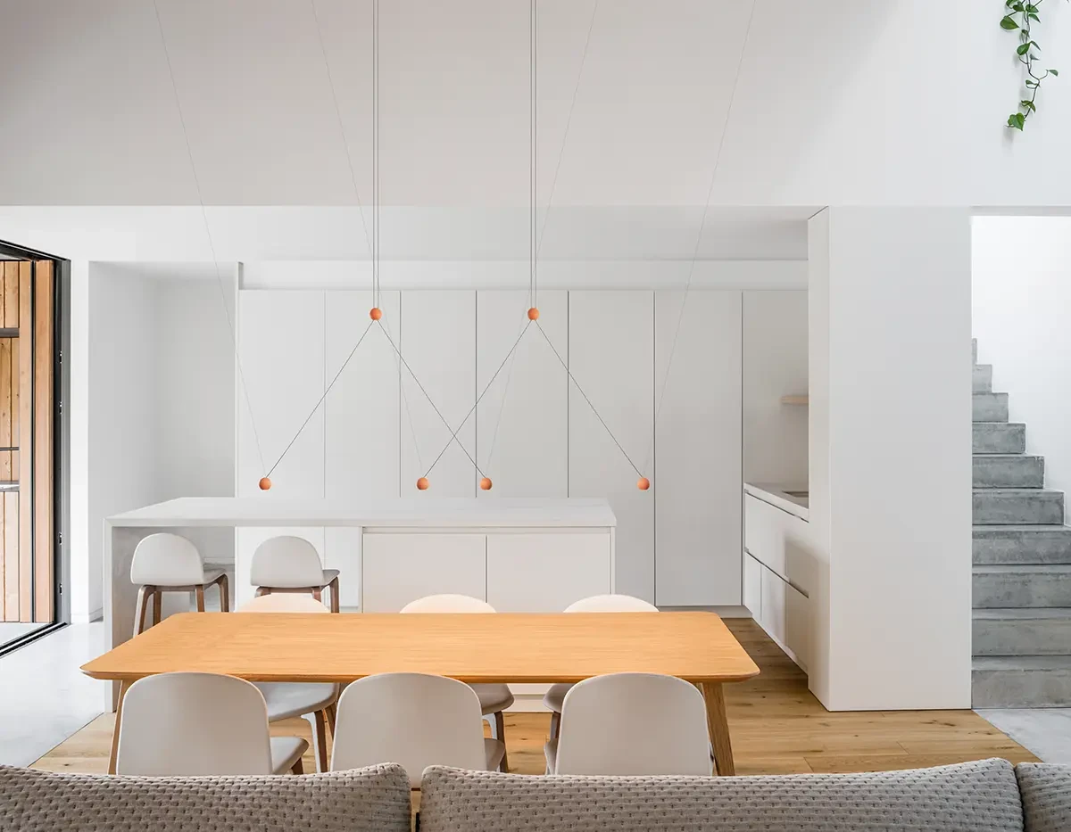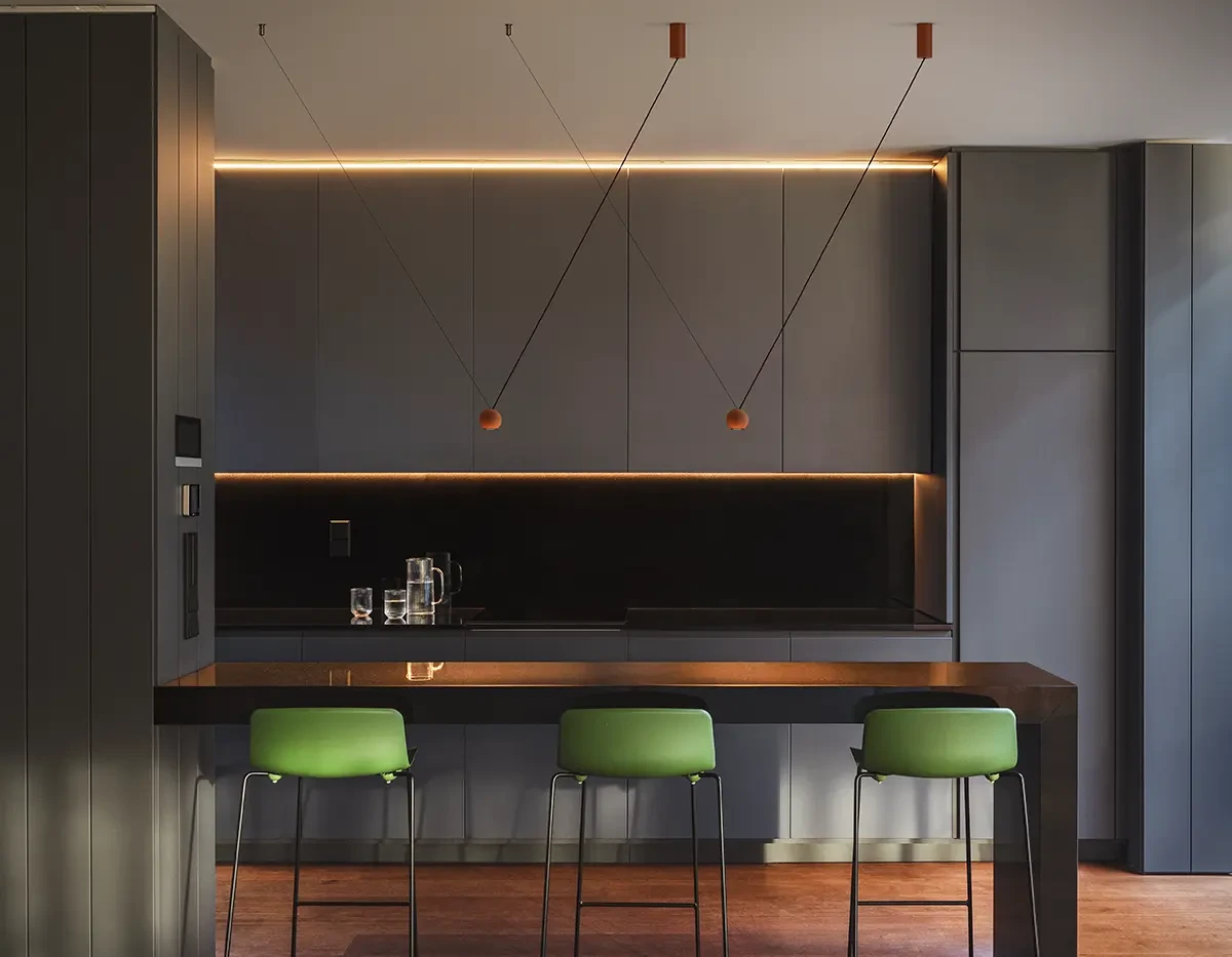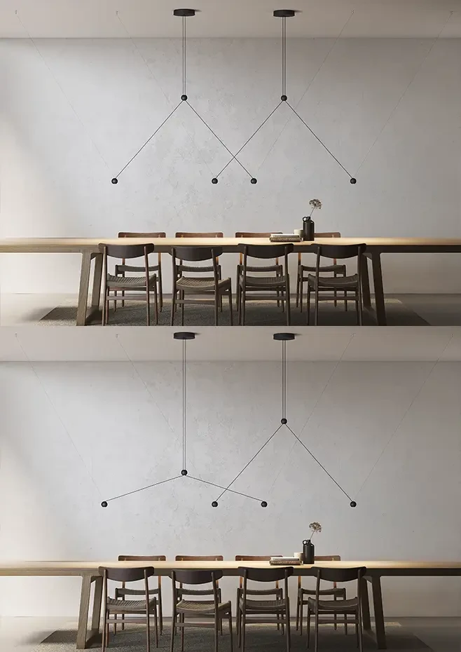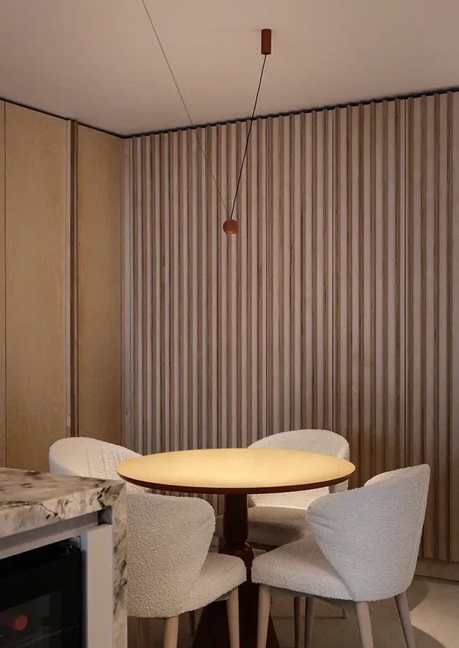 Suspension lamp designed for ambient or accent lighting, offering a direct and intense beam. A spherical diffuser hangs from a steel cable, which anchors to the ceiling, allowing precise positioning. The electrical cord runs directly to the canopy, which can be mounted either on the ceiling or on the wall — with the steel cable always fixed to the ceiling. The lamp’s height is adjustable, making it suitable as a pendant light above a table or counter, or as a ceiling or wall-mounted accent piece. Its off-center power outlet adds flexibility for creative compositions and installations.