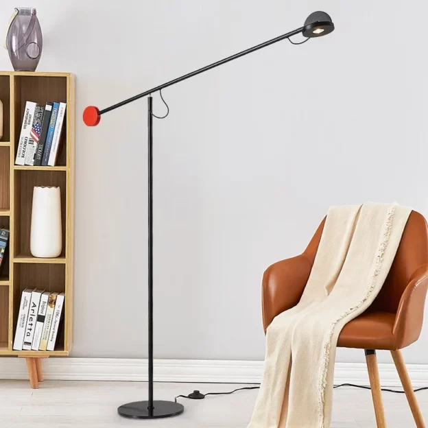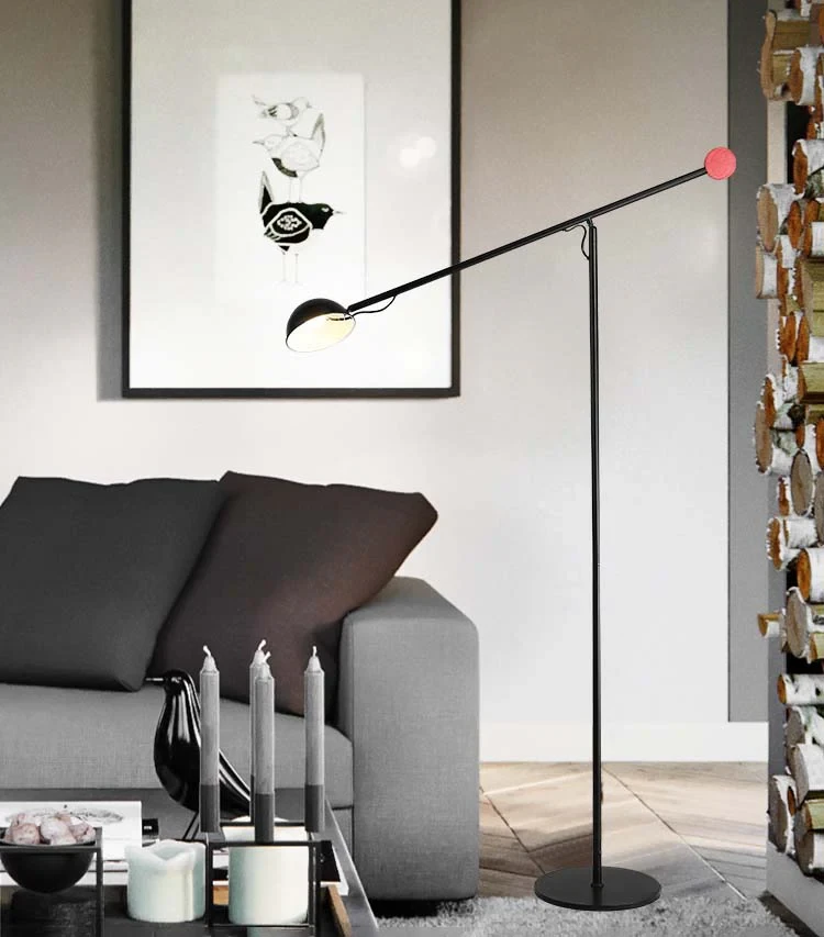 This collection consists of a table and floor lamp, as well as a separate torchier-style floor lamp, all of which use mixed materials of different densities, such as aluminum and steel, to create a unique counterweight system. This structure affords great precision when moving the lamp, reaching different heights and distances to adjust the position and direction of the light beam.