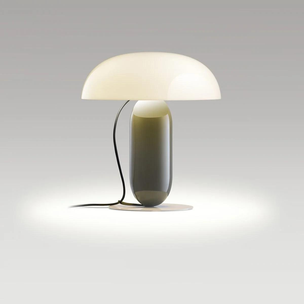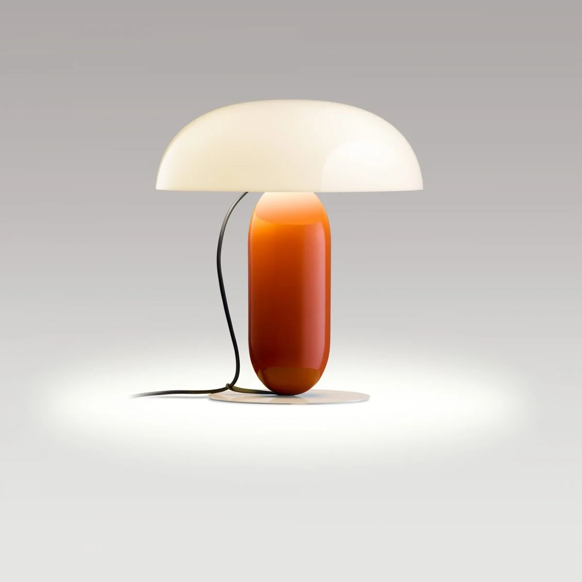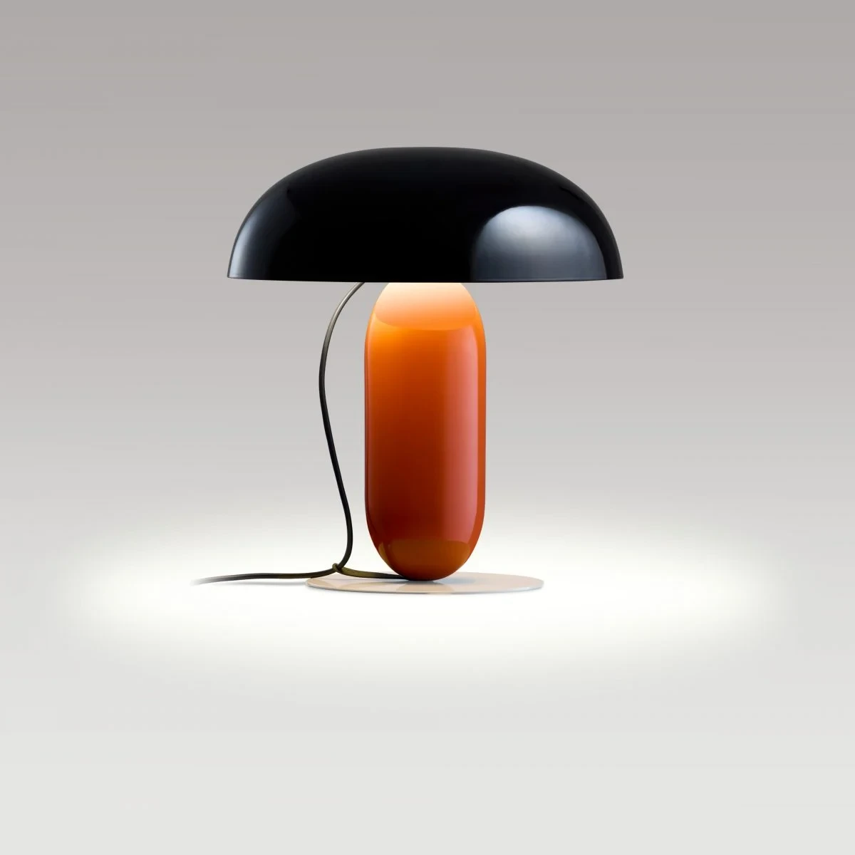 However, the beauty of this table lamp doesn’t come solely from its composition; it’s defined by its palette of colours. The shade is available in pale pink or black, opaque versions that provide a direct light, or in opal methacrylate for softer illumination. The stem is available in orange and moss grey and the base in stone grey. This range of colours has created a matrix collection of different versions, each with their own aesthetic, from subdued to more expressive. It’s available in two sizes: 26 cm in diameter and 30 cm in height, and 36 cm in diameter and 41 cm in height. The cable also forms part of the lamp’s design, descending from the top while a clip guides it, anchors it and stops it from escaping, adding to the overall visual appeal.