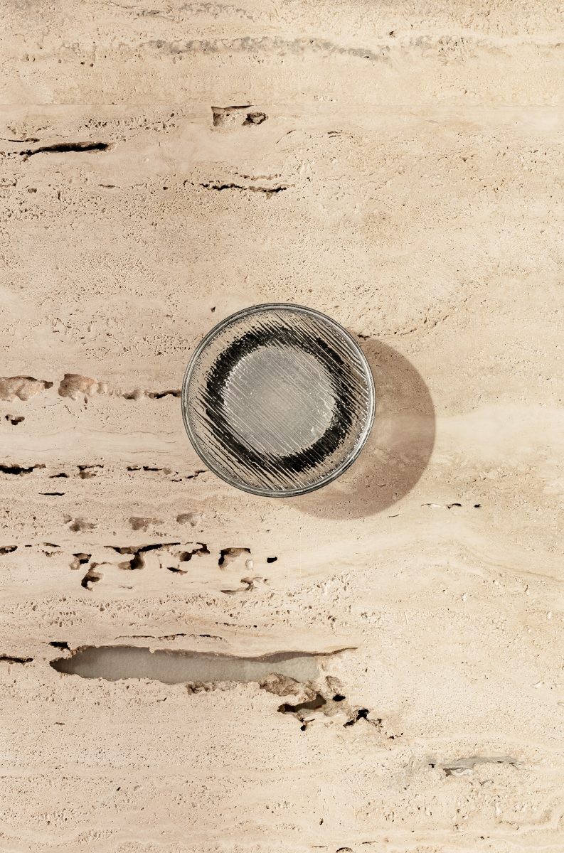 resembles a shining block of ice, with an irregular texture that invites you to touch it.