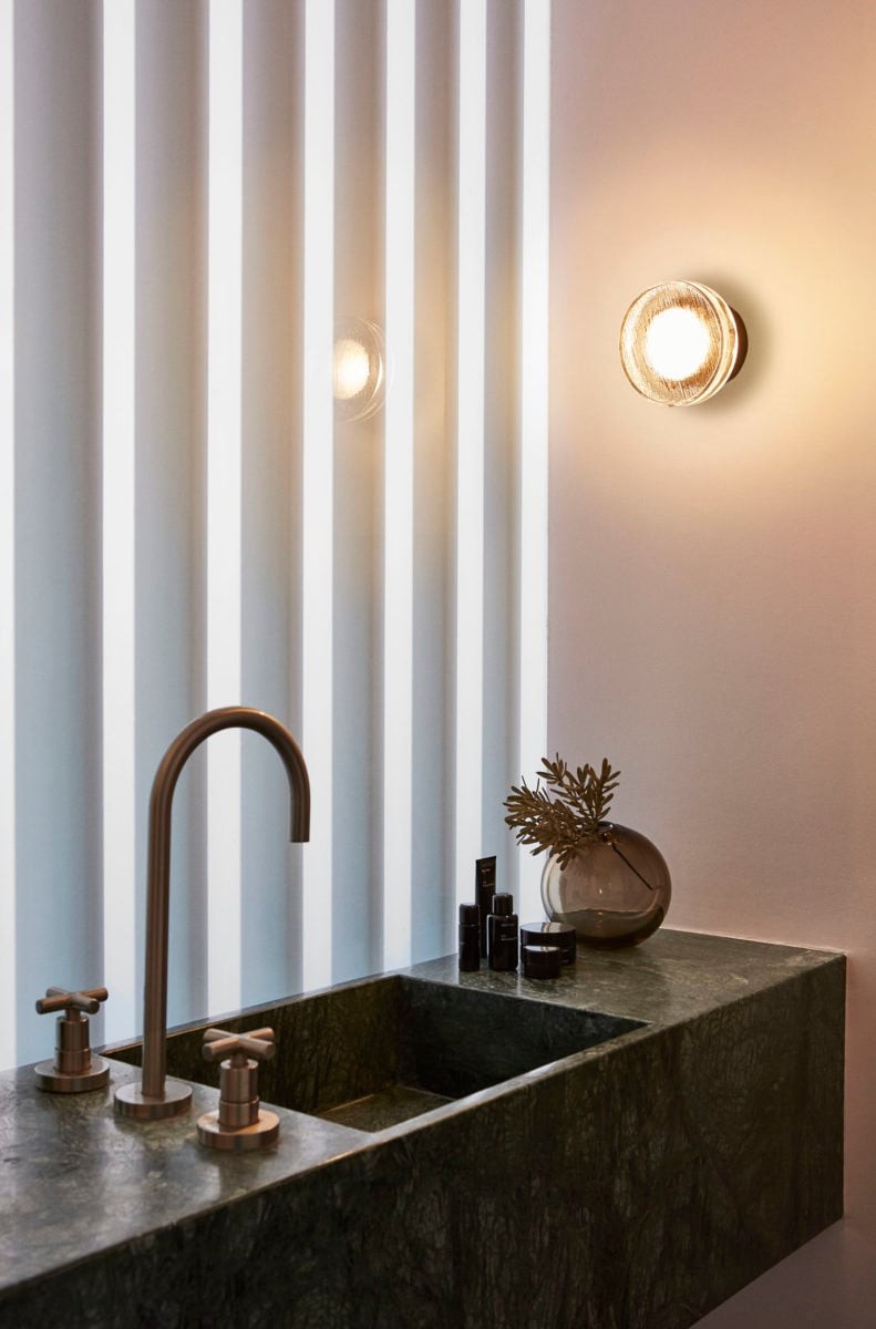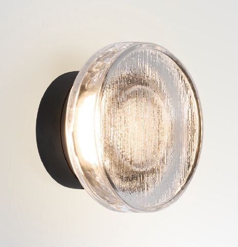 Wall light for indoor and outdoor use, with a pressed glass diffuser. Its wavy shade
