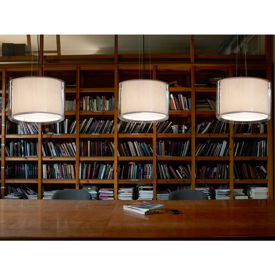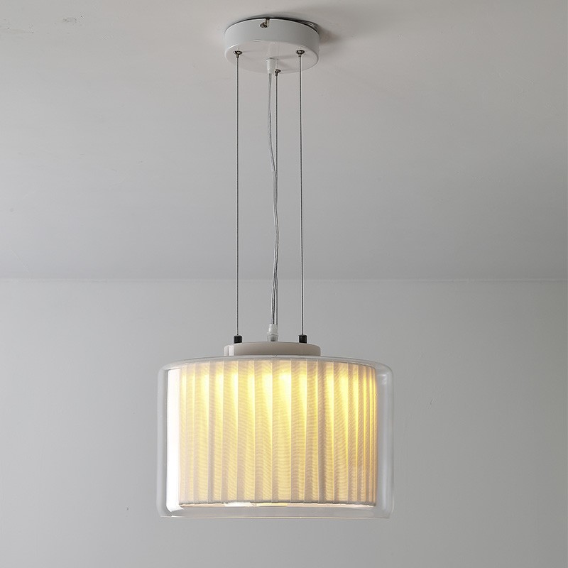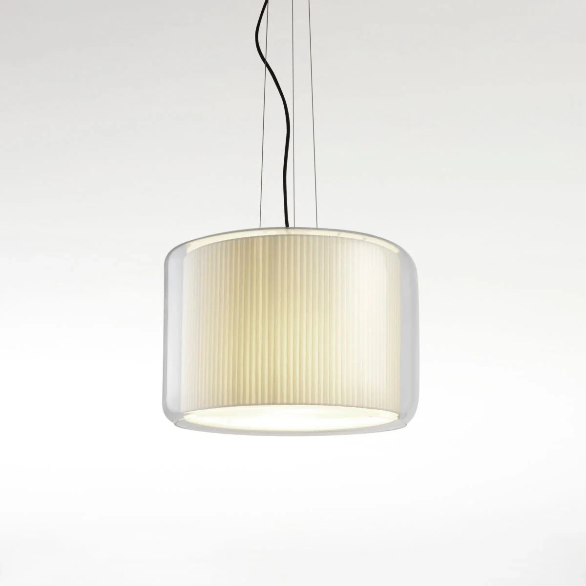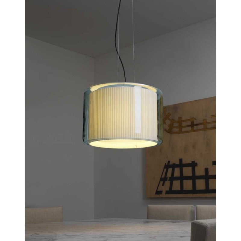 Textile shade that floats inside a transparent blown glass structure. Opal diffuser disc on the lower part of the version 44. Natural cotton ribbon, Pearl white