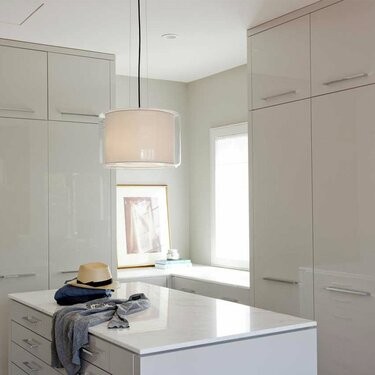 The beauty of the Mercer comes not only from its pure shape but also from how its materials blend together. The transparent blown glass structure envelops the textile shade, which appears to float, conveying lightness and sophistication. The inner diffuser fabric is available in two finishes: in ecru cotton ribbon, and in a more modern and minimalist version, in pearl white.