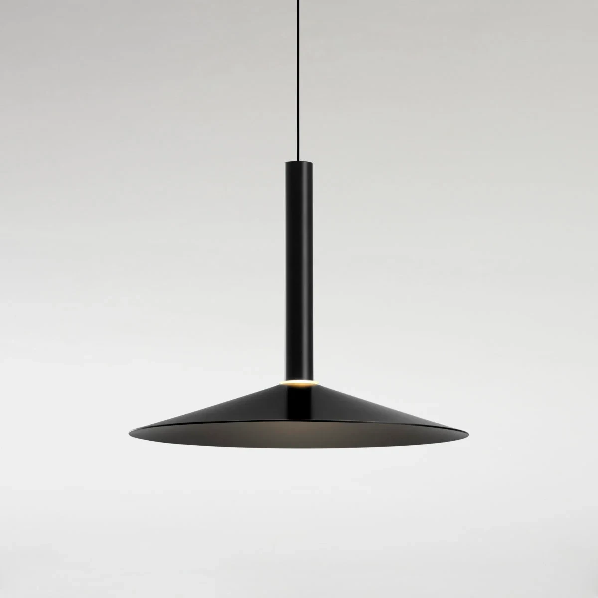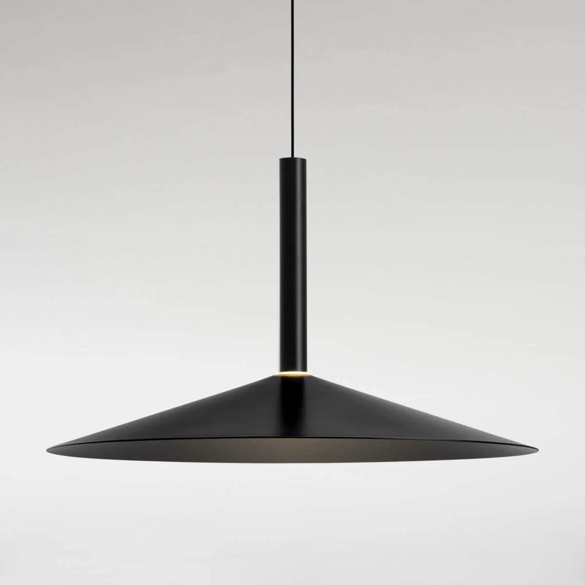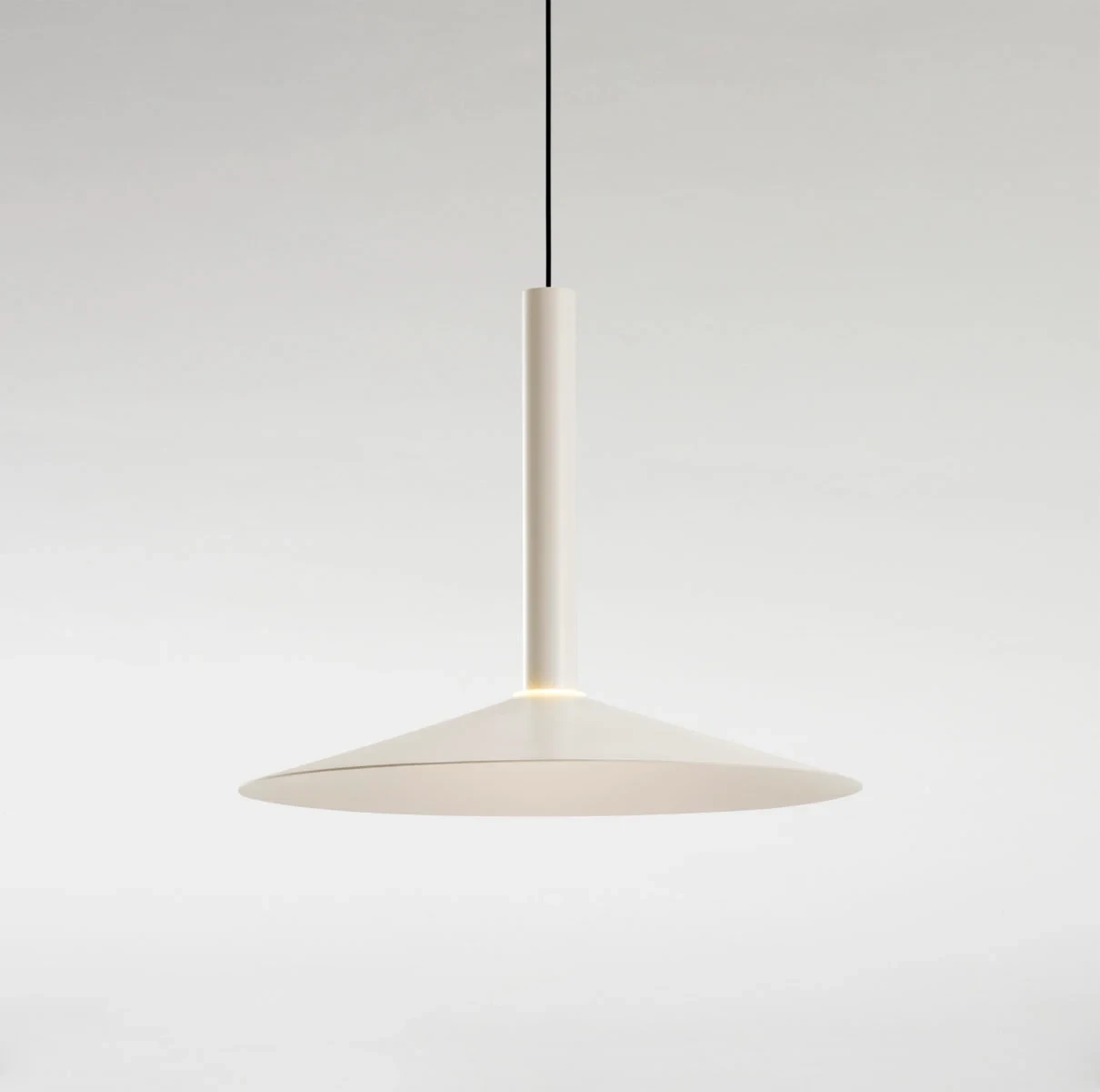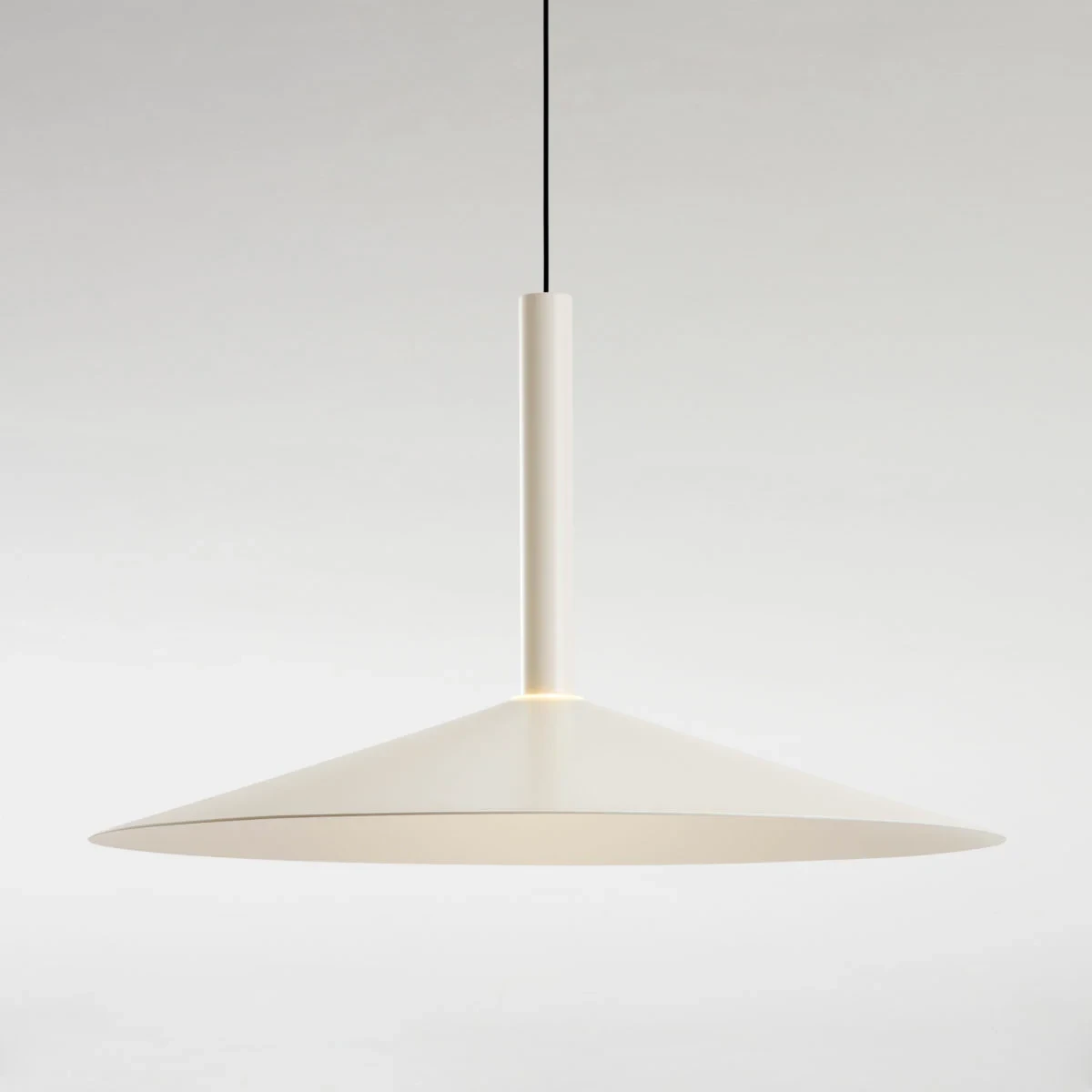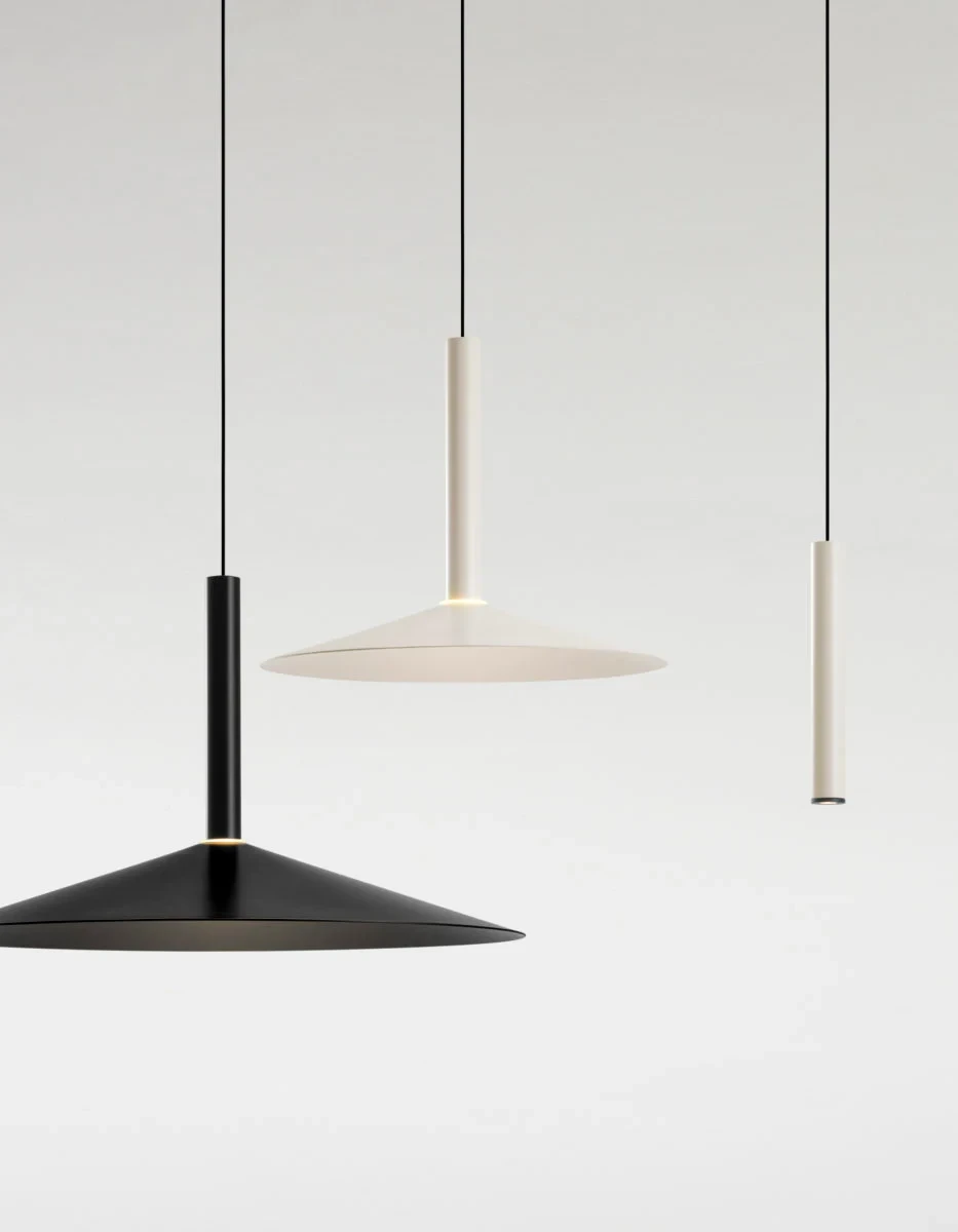 Paradoxically, this new design starts by deconstructing the archetype of a lamp; by synthesizing it as much as possible, only a cylindrical body remains, suspended with a built-in LED. To this cylinder we can add different conical shades in oyster white and black in several sizes. But most ingenious of all is that each of these lamps can have a simple counterweight such that when they are hung between two points, they can be moved.