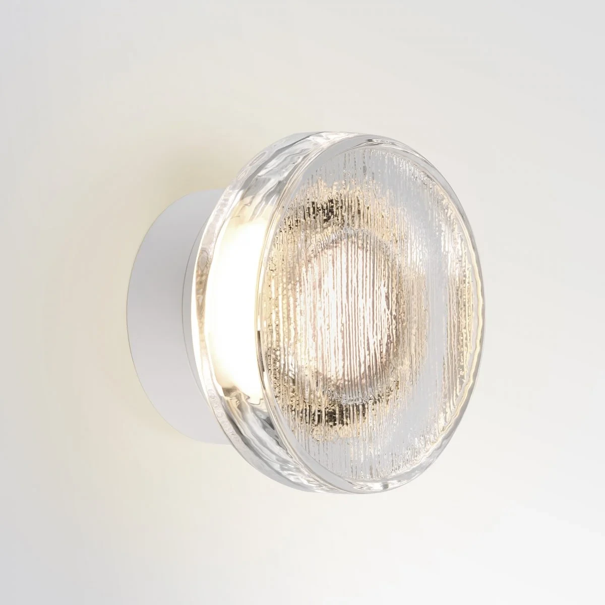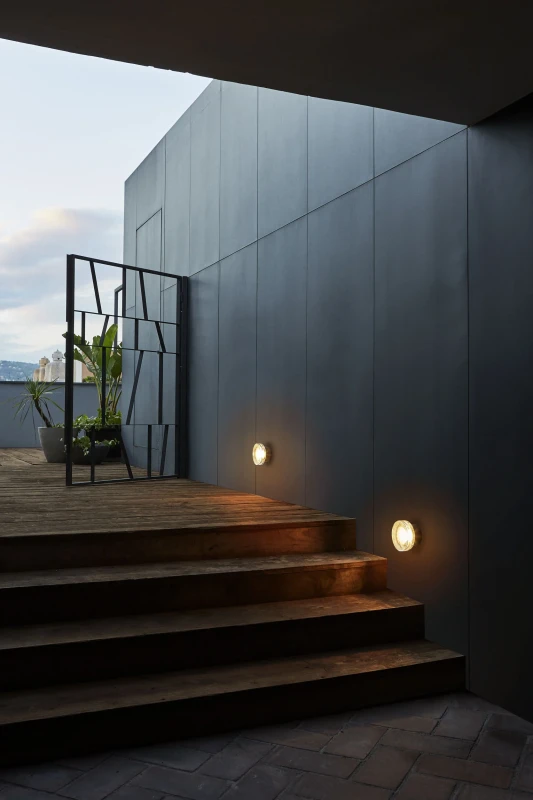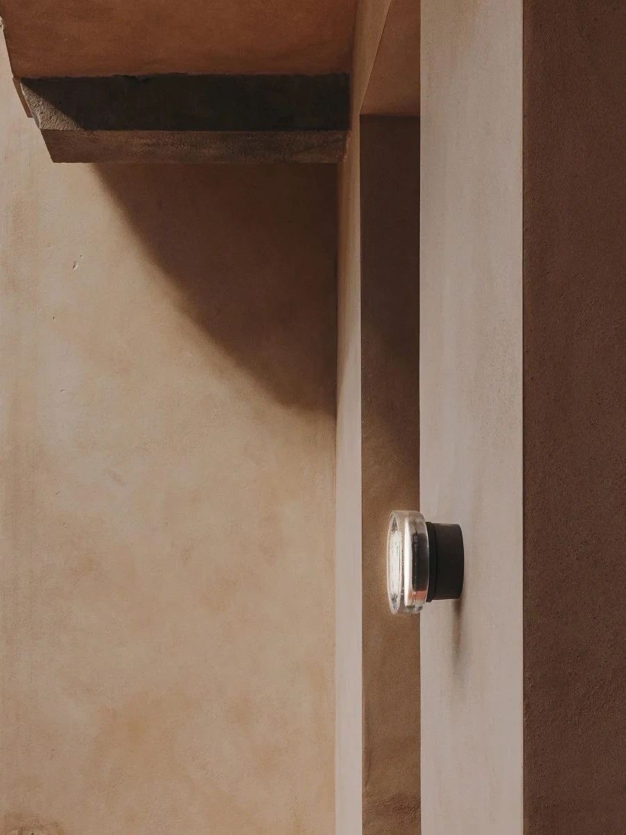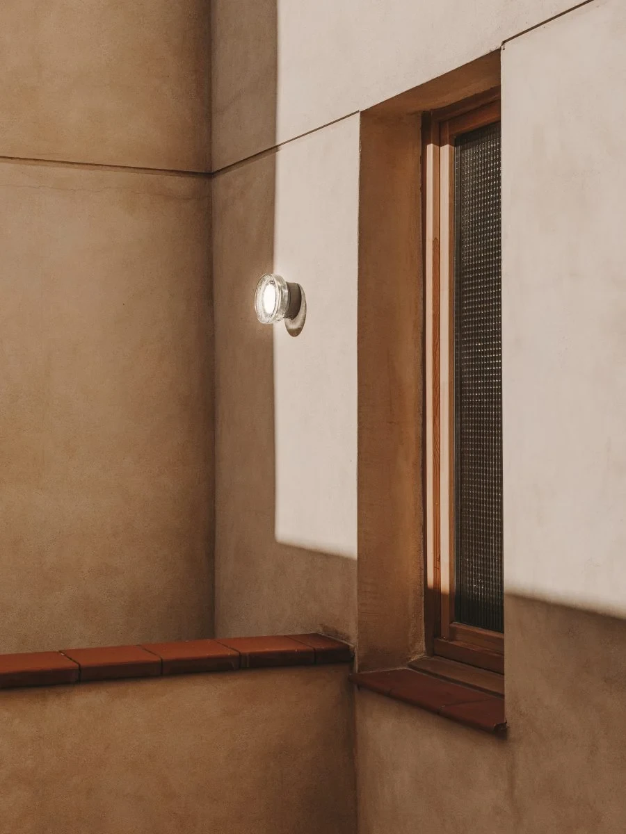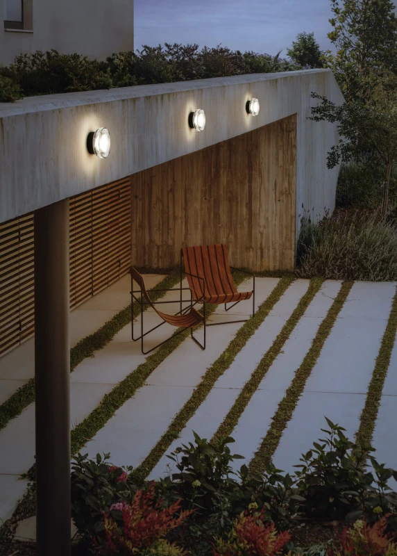 Compact indoor and outdoor wall lamp with a pressed glass diffuser. Its undulating shade covers the light, blurring it. It doesn’t settle for just providing light, it also manages to create an ambiance.