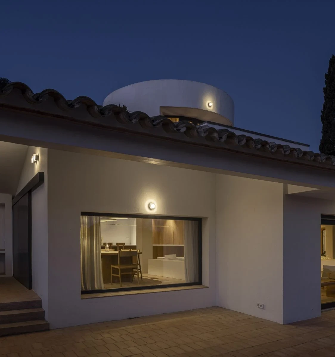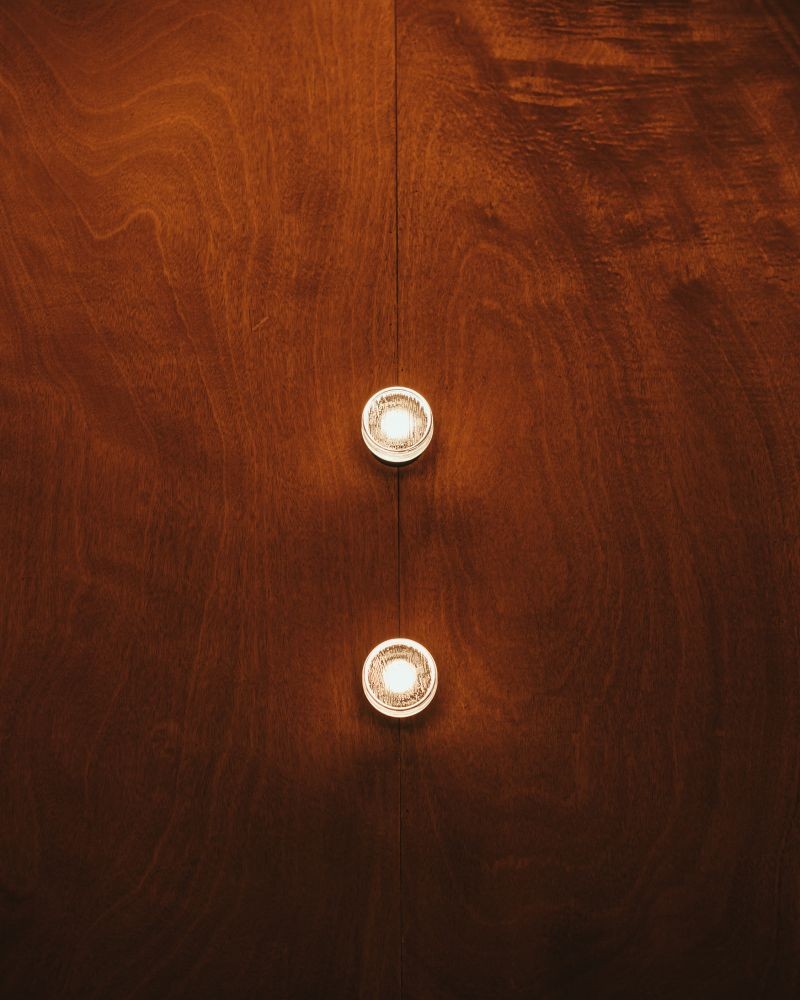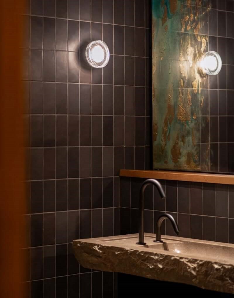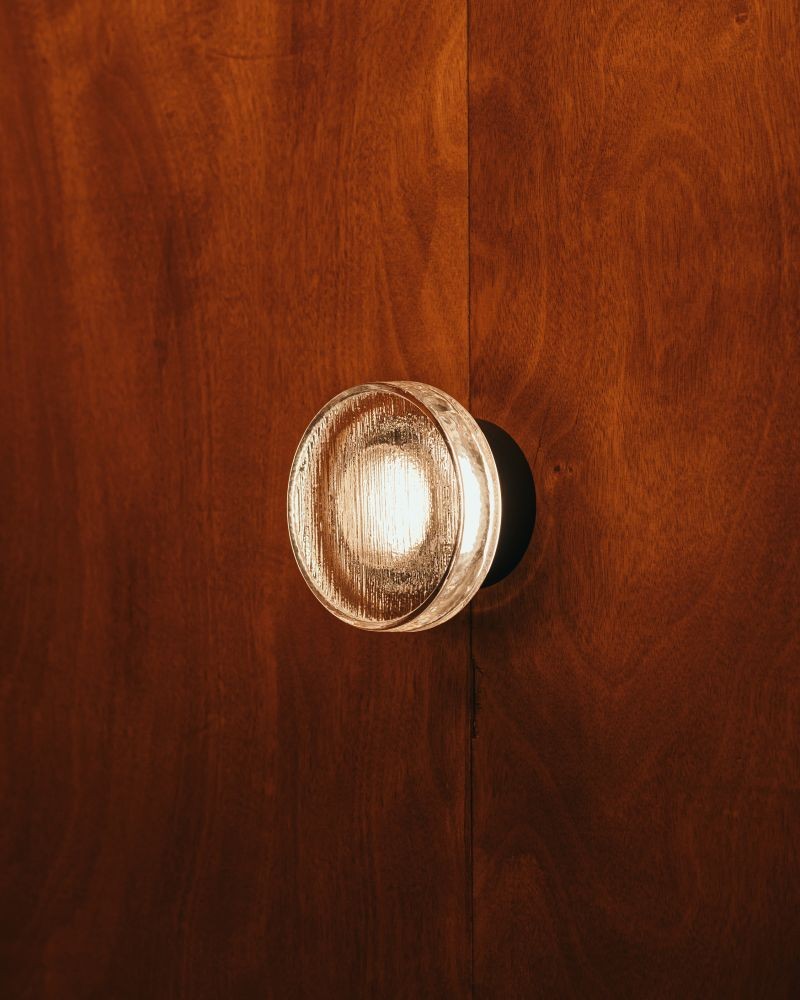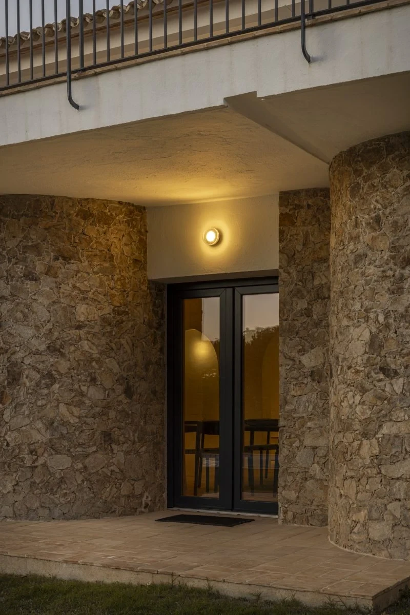 Compact indoor and outdoor wall lamp with a pressed glass diffuser. Its undulating shade covers the light, blurring it. It doesn’t settle for just providing light, it also manages to create an ambiance.