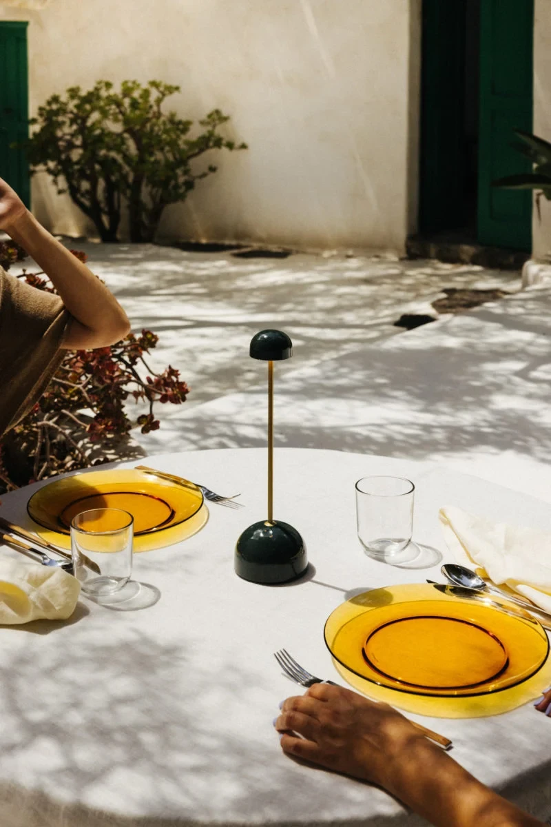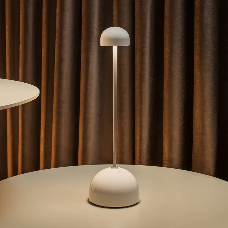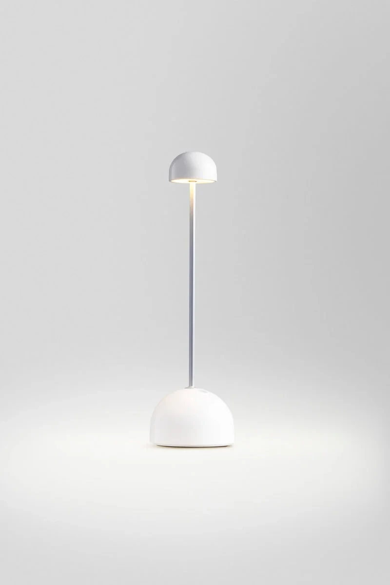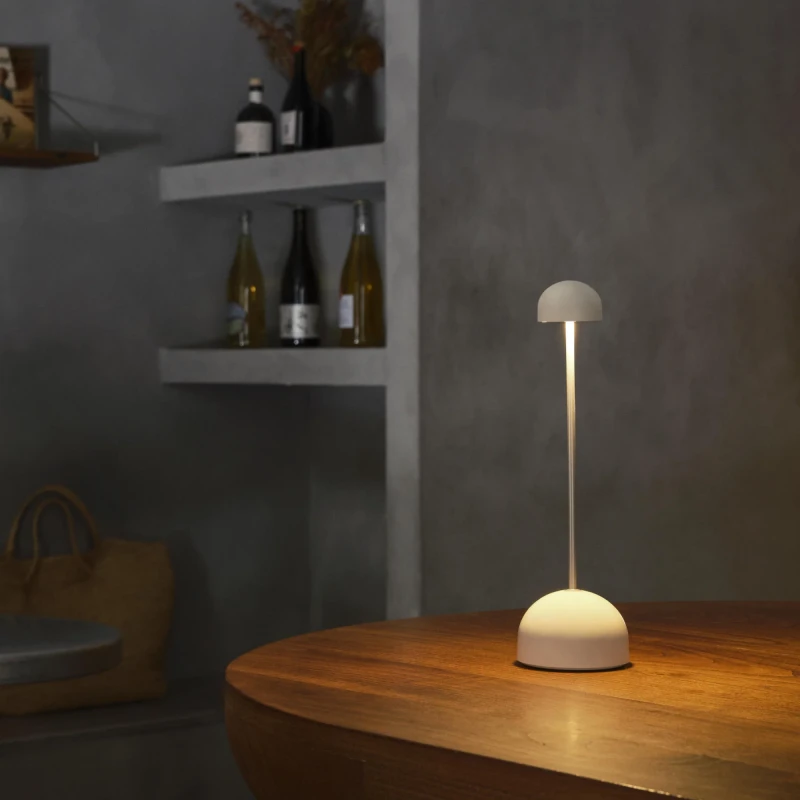 Free of cables, lightweight, with a simple structure and neutral colours, this design becomes a discreet part of the table, without formal or chromatic excesses. An object simplified to the max that allows easy placement and mobility and ensures good lighting in restaurants, bars, cocktail bars, terraces and patios.