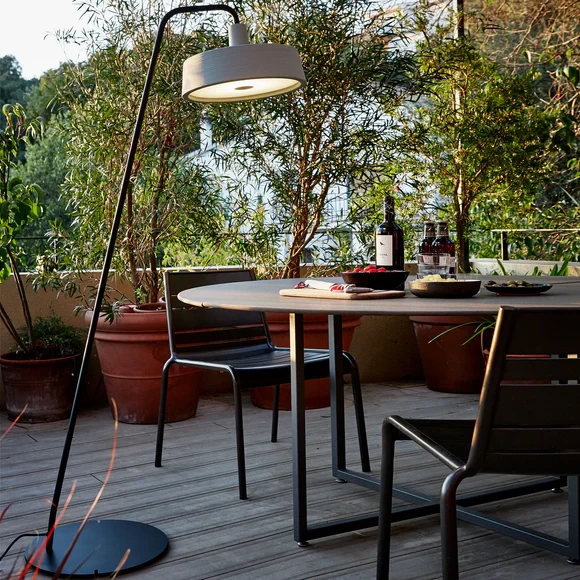 The use of rotation-moulded polyethylene allows us to easily offer this fixture in a wide range of sizes. The floor version has a 38 cm diameter shade that is available in various finishes: black, grey, white, sand, and sky blue.
